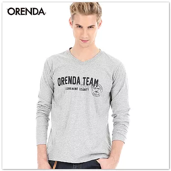 ORENDA 團隊就是力量V領TeeL麻灰字母印圖 × 棕梠樹小島郵戳,穿上100%純棉T恤,認真工作100%,也要用力玩樂100%!