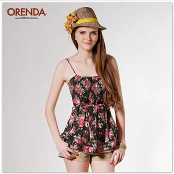 ORENDA 玫瑰花園低胸傘狀細肩帶S黑色花布可自由拆卸蝴蝶結繫帶的細肩帶上衣,是一款超修身的小心機單品!胸前縫有亮片串珠點綴,低胸+高腰的傘狀剪裁有豐胸和遮掩腰腹的效果,玫瑰印花面料輕鬆打造浪漫度假LOOK!